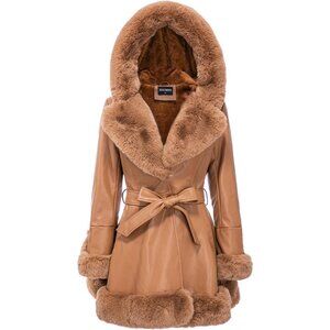 Women's Khaki With Gran Oriente Faux Leather Winter Coat with Fur Collar Belted