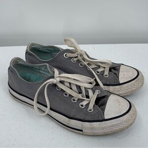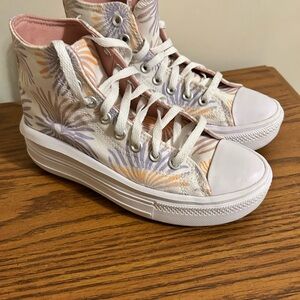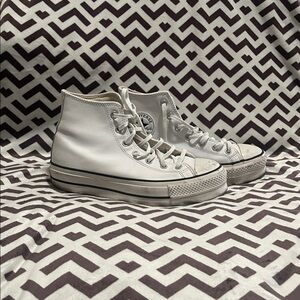Light gray Converse high-top sneakers with suede finish. Features classic lace-up style and signature logo patch.