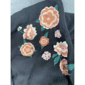 Lightweight open-front kimono with boho floral embroidery on sleeves and shoulders. Features wide sleeves and a relaxed fit, ideal for layering over casual or festival outfits. Black crinkled fabric adds texture and movement. Gently worn with light pilling under one arm as shown. Please see photos for measurements.