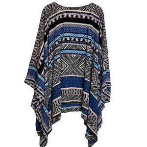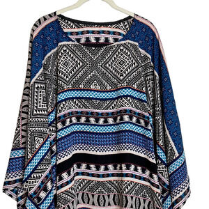 Womens Kimono Sleeve Tunic OSFM Blue Black Tribal Print Swim Cover Up Chiffon