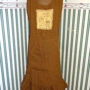 Women`s vintage brown plaid Kindred Spirits apron by Park Design. 100% cotton, Made in India. Apron is full body and features a large pouch, ties, bottom pleats and a cotton Kindred Spirits plaque. Length from center neckline to hem is 31" and the back ties are 33" each. All I can see are two very small white spots on the pleating near the hem that should was right out. Estate find.