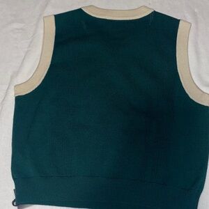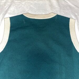 Stylish green sweater vest with cream accents. Perfect for layering and adding a touch of elegance to your outfit.