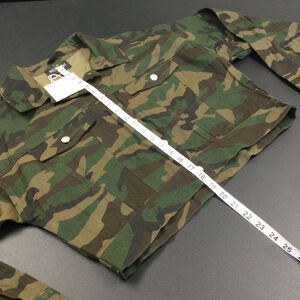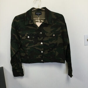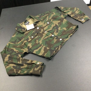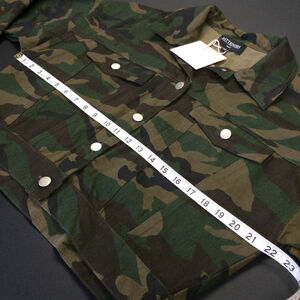 This is a new with tags Kittenish brand camouflage jacket. The jacket is made of 100% cotton and features a button-down front, two chest pockets with button closures, and long sleeves with buttoned cuffs. The back of the jacket has the word "KITTENISH" embroidered in gold lettering. The jacket is a size small and appears to be in excellent condition with no visible imperfections.