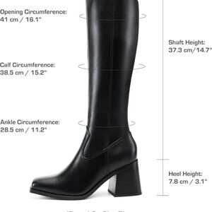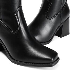 Features: Faux leather tall boots with a bold square toe and a durable 16-inch circumference shaft. The chunky 3-inch block heel offers great height without sacrificing comfort. The side zipper makes them easy to slip on and off, perfect for busy days or quick outfit changes.