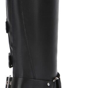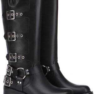 Features: These tall, knee-high boots blend edgy biker style with a touch of sophistication. Crafted from high-quality PU leather with a vintage-aged fabric detail, they feature a sturdy buckle closure, square toe, and a chunky 1.8-inch heel. Wide calf design (11.8 inches) makes them comfortable for various leg shapes, and the slip-resistant TPR soles promise confident walking.