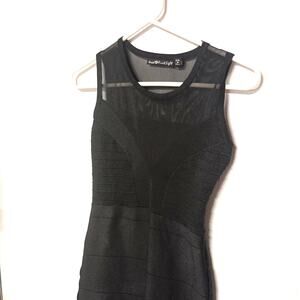 Stretchy knit bodycon dress. Sleeveless pull over. Sheer chest and back area. Hidden side zipper