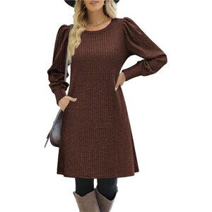 This long sleeve tunic dress features long puff sleeve, crew neck, two side pockets, Ablove knee length, A-line tunic dress, pullover sweater dress, loose fit flattering dresses, solid color.