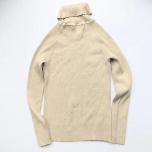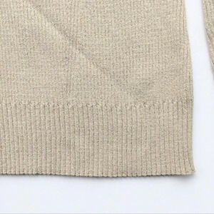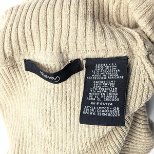 Raisey size Small, metallic gold festive, fitted, long sleeves, rib knit, fold down turtle neck pullover sweater, has a slim silhouette that flatters the body’s contours. 58% Rayon/4% Nylon/11% Polyester/7% Metallic.