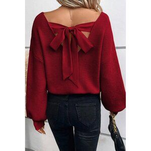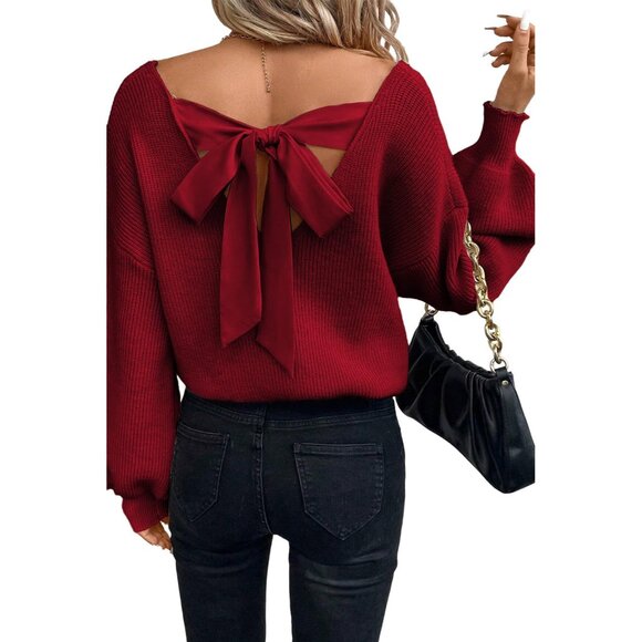 Features: This sweater is made from a soft and warm blend of 50% Viscose, 28% Polyester, and 22% Polyamide—super comfy for all-day wear. It has a deep V neck with a cute bow detail, a backless design, and an oversized fit that’s effortlessly chic. Long lantern sleeves with a drop shoulder give it a relaxed, fashion-forward vibe, perfect for fall and winter outfits.