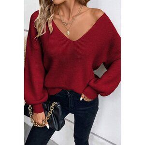 Womens Knit Sweater V Neck Off Shoulder Oversized Long Sleeve Pullover