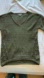 Acrylic and cotton knit long sleeve. V-neck with two side cut out designs. It’s a thick material with breathability because of the knit pattern. Deep olive green color, only worn twice. Women’s small but fits like a medium on me and I’m 128lbs.