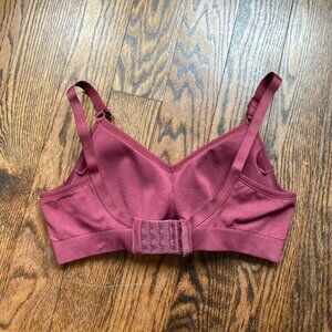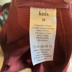 This is a pre-owned Knix brand bra, size medium. The bra is a solid burgundy color and made of 91% Polyamide and 9% Spandex. It features adjustable straps and a hook-and-eye closure at the back with four rows and three columns. The bra has a seamless design with molded cups. There are no visible stains or teard present.