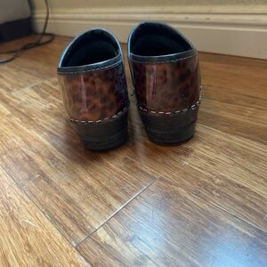 Women's Koi Sanita clogs - Size 38 - Patent leopard print. Solid shoe, slight scuffing on right toe. Cute flower details on sole.
