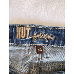 These are pre-owned KUT from the Kloth jeans, size 14. The jeans are made of 99% cotton and 1% spandex. They feature a standard five-pocket design with a zip fly and button closure. The denim has a medium wash with slight fading. The waist measures approximately 16.5 inches across. There are no visible stains, tears, or significant wear. Very minor tiny snags-see photo. Overall, they are in very good condition. Style number KP488MC3N.