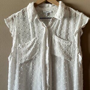 Bar III's pretty blouse sets the tone for whimsical style with clip dots scattered throughout, with a point collar and button-down front for a polished finishing touch.