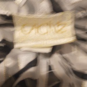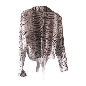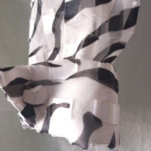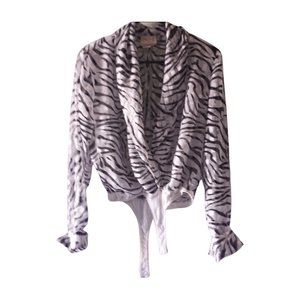 Women's Cache black and white tiger striped sheer chiffon wrap style bodysuit with long sleeves, buttons on the cuffs of the sleeves and black velvet stripes. White lace strap with metal button snaps. Collar around the neck down to lapels on the front.