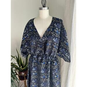 #vintagedress #puffsleeve #navyblue: festival dress bohemian maxi Asian Inspitre, Asian Style Komono Dress Chinese Print Dynasty vintage puff sleeve dress printed boho dress relaxed fit maxi gown whimsical print vintage clothing navy maxi dress