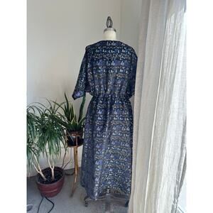 Beautiful vintage boho-style maxi dress in a rich navy blue with whimsical multi-color print. Features a flattering V-neckline, voluminous puff sleeves, and a gathered waist for a relaxed yet feminine silhouette.