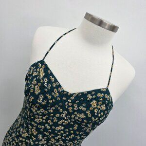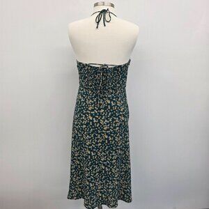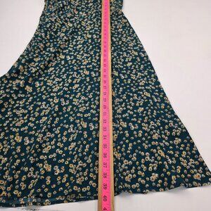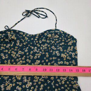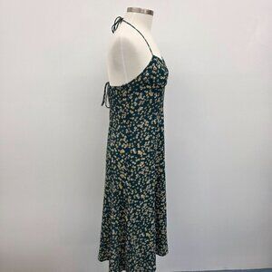 Womens L Green Yellow Floral Print Midi Dress w/Sweetheart Neckline & Tie Back