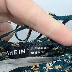 KEYWORDS: floral midi dress, sweetheart neckline dress, tie back dress, boho summer dress, cottagecore outfit, green floral dress, spring midi dress, lightweight summer dress, smocked back dress, Shein dress L, breathable fabric dress, side slit dress, romantic summer dress