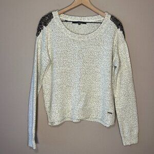 Women's L Guess Embellished Sweater White Metallic Gold Thread Crew Neck