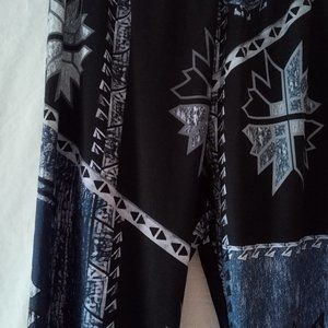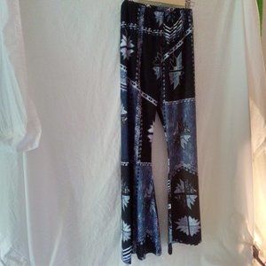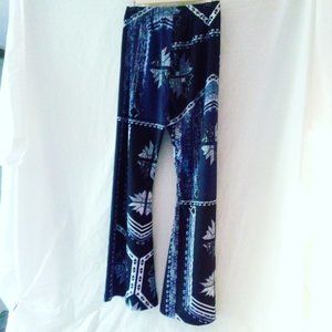 Women's J.C Fashion blue and white geometric print stretchy flare pants with an elastic waistband