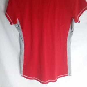 Womens Majestic St. Louis Cardinals red and light gray jersey style shirt with short sleeves and a v style neckline. Red white and blue font saying St.Louis Cardinals EST. 1892 on the front.