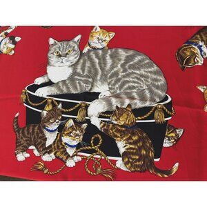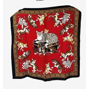 Embrace your inner cat muse with this soft, square Year of the Cat print scarf that exudes playful elegance and subtle edge. With flat measurements of 34" × 33" (86 cm × 84 cm), it’s perfect for wrapping around your head, styling as an accent on your purse, or letting it fringe over your shoulders. Crafted from a delicate lightweight (likely) poly‑blend fabric (feel the drape and gentle translucence), this feminine piece feels airy yet luxe. The pattern features whimsical feline motifs that nod to your “crazy cat lady” aesthetic while remaining effortlessly chic. This scarf is in good condition — no tags remain, but it has been well loved and retains its full allure without snags or visible damage. Whether worn in boxy folds, twisted as a neck knot, or tied in a bow on your bag, it brings a soft feline whisper to any outfit. Origin unknown, this piece blends artisan textile heritage with modern cat-inspired flair. Measurements: 34″ × 33″, Condition: good, no tags, well maintained#catvibe #felineaesthetic #scarflove #bohofemme #catlady
