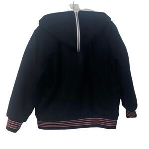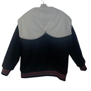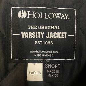 Ladies size Large Short HOLLOWAY Varsity Jacket. Black with red, black, and white striped trim at the cuffs and hem. Snap front. White fleece lined hood with zipper so hood can lay flat when unzipped. Quilted lining. Excellent pre-owned condition. Very lightly worn, if at all. FLAW: There is some light dirt around the edge of the white hood, probably from storage, and 2 tiny red specks on the hood that could be thread, (see photos). Fragrance may be present from laundry products or use. This is a blank jacket that has not been embroidered or customized anywhere. I'll be listing some red jackets as well, some new.