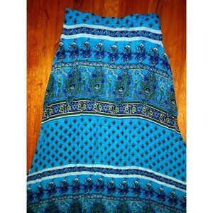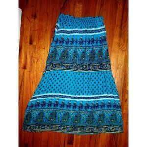 Womens L maxi skirt Cottagecore Peasant modest Boho printed teal blue side slits