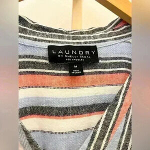 Discover effortless style with the Laundry by Shelli Segal Women's Button-Up Shirt. This versatile piece, in a refreshing blue striped pattern, is perfect for any occasion. Crafted from a blend of linen and viscose, it offers a lightweight feel and breathable comfort. The collared neckline and long sleeves with rolled cuffs add a touch of sophistication, while the chest pocket and high-low hem provide a modern twist. Easy to care for, it's machine washable for your convenience. This pre-owned shirt is ready to become a staple in your wardrobe, offering both style and practicality.