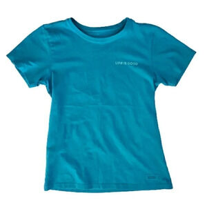 Women's Life is Good XS extra small teal crewneck tee t-shirt top that says "Soak It In" on the back scenic graphic. Features soft, comfortable, fabric. Measurements are approximately 22" in length and 26.5" from pit to pit. Material content is 100% cotton.