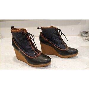 Darling Women's L.L. BEAN SIGNATURE DUCKTRAP LACE UP PLATFORM WEDGE BOOTIES Size 7.5. Heel Height is 3.5". The Lower part is Green leather and the upper lace-up is Blue Nylon. There are a few scuffs in the toe area, otherwise in Great Condition!