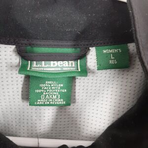 Has a stain on sleeve shown in pictures Stay stylish and warm this winter with this women's L.L. Bean jacket. The outer shell is made of durable nylon and comes in a solid black color with a mid-length design. The full zip closure and collared feature add extra protection from the cold, while the polyester lining keeps you cozy. This medium weight jacket is perfect for casual occasions and outdoor activities during the fall, winter, and spring seasons. The zipper accents provide an extra touch of style and the size is a regular fit for women's size large. Upgrade your wardrobe with this basic jacket from a trusted brand, L.L. Bean.