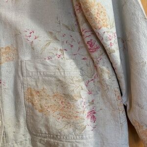 Love this jacket, it's sturdy cotton... feels like a heavy linen or almost twill, lined for warmth and structure. Sort of boxy style with half-pleats around the patch pockets in front and at the same place in the back for a little shaping. 2 outside patch pockets. Button front. Collared.