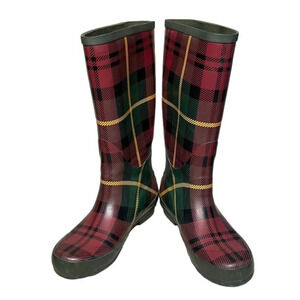 Women's LLBean Wellie Rain Boots Black, Red Plaid Rubber Boots Size 7