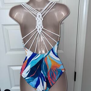 Colorful tropical leaves on white swimsuit with a plunging neckline and strappy, macrame-inspired back.