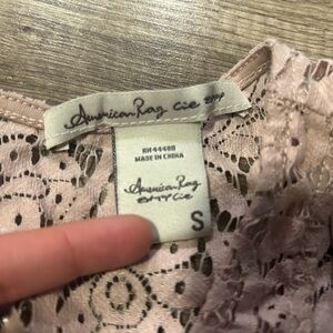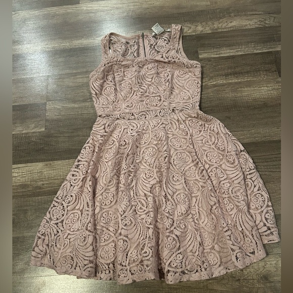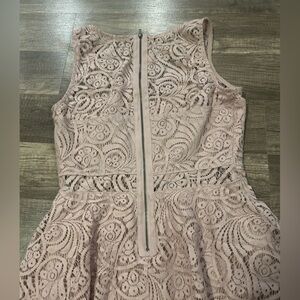 This dress is super cute, and has only been worn a couple of times. No rips, snags, tears, or stains. Special features include light pink lace, see-through strip (across the stomach), and zipper in the back. Super cute!