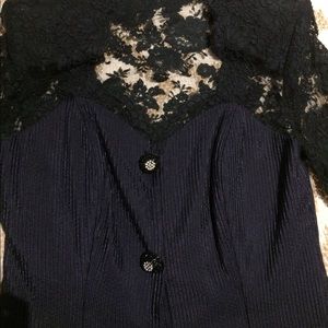 Magnificent black lace embellished jacket and skirt in a stunnning blue/dark purple hued fabric. Lined skirt with lace trim. Rhinestone gorgeous buttons, beautifully made with snap closure on jacket.
