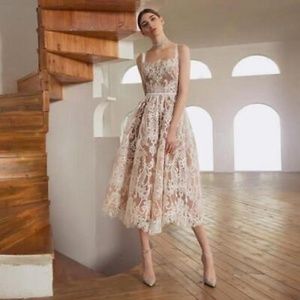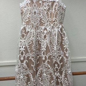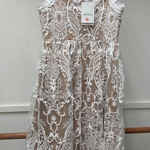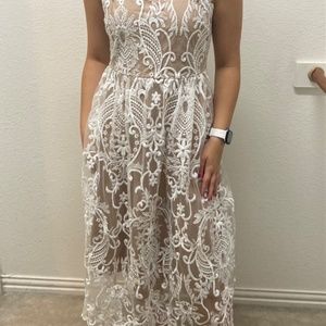 Ivory lace dress with beige lining underneath. Zipper back. Lace straps. Asian sizing says it is a large, but it fits like a true size 8. Tags attached, never worn. No damage, perfect condition.