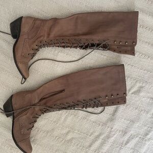 Step out in style with these chic lace-up knee-high boots. Perfect for any occasion, these boots offer both comfort and elegance. The rich brown color adds a touch of sophistication to your outfit.