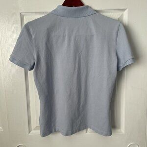 Women's Lacoste Slim Fit Light Blue Polo Shirt. Understated Lacoste alligator logo in light blue. 4-button closure. Banded sleeve hem. Perfectly preppy in every way. Wear with khakis or denim. In excellent condition. Was only worn once and originally purchased from Saks.