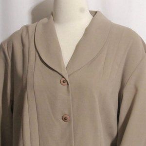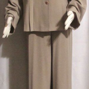 The color is a rich neutral shade of beige. It has a rounded fold down collar and the front is straight with no lapels. It buttons with 3 pearlized beige decorative buttons The sleeves are long. The body is very softly tailored at the waist for figure flattering fit. The jacket falls over the top the hips. The pants are softly tapered with a wide leg opening. The pants zip on the side and have an elastic band in the back of the waist. The entire suit is sleek and figure flattering from top to bottom.