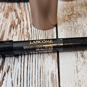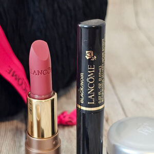This is a new Lancome beauty set, containing a black drawstring bag with pink ribbon, a 1.7 fl oz tube of Creme-Mousse Confort comforting cleansing cream-foam with rose extract for dry skin, a 4.2 fl oz bottle of Bi-Facil double-action eye makeup remover, a 5 ml tube of Absolue The Serum intensive concentrate with grand rose extracts, a 0.16 fl oz tube of Absolue The Serum intensive concentrate with grand rose extracts, a Lancome Black Noir mascara, and a Lancome Rouge Absolue lipstick. All items are new with tags and in their original packaging. The set is in excellent condition with no visible imperfections.