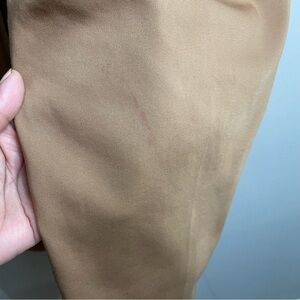 Elevate your wardrobe with these stylish tan dress pants. Perfect for any formal as well as a casual occasion. Slacks are in very good condition…have a flaw(discoloration)right front lower leg and a flaw(discoloration)right back lower leg; see last 2 photos.