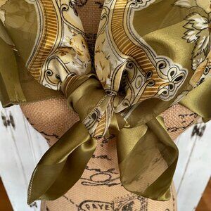 -This scarf has a gold and white baroque floral pattern, similar to those produced by Hermes