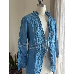Women's Large Blouse Blue Cotton Eyelet Tie Boho Embroidered Lace Jacket Rare