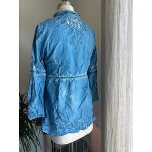 Stunning vintage denim-blue cotton blouse with allover floral eyelet lace embroidery and scalloped trim. Indigo-natural dyed, so there are some inconsistencies in color throughout, mainly on the back. Features an open front with a delicate tie closure and wide bell sleeves. Can be worn as a lightweight boho jacket or layered blouse. Intricate cutwork detailing adds vintage romance and femininity.