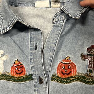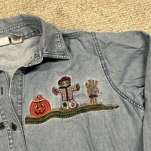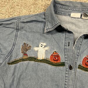 Womens Large Embroidered Denim Jean Shirt Fall Ghost Pumpkins Button Down