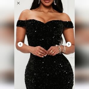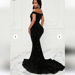 Shine at any event with this stunning black sequin off-shoulder gown. Perfect for making a statement, this dress combines elegance and glamour effortlessly.